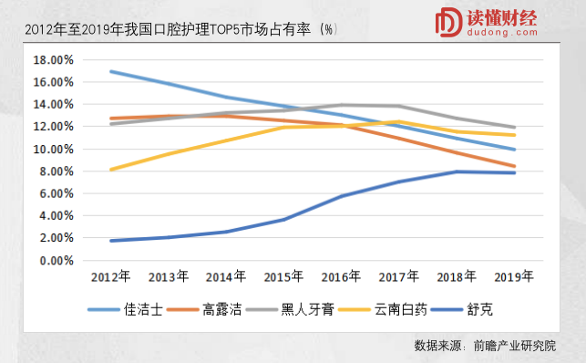 2012年至2019年我国口腔护理TOP5市场占有率(%)