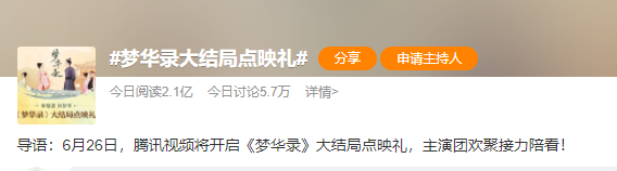 6月23日当日,#梦华录大结局点映礼#话题的阅读量超过2.1亿次,讨论次数也超过5.7万次。