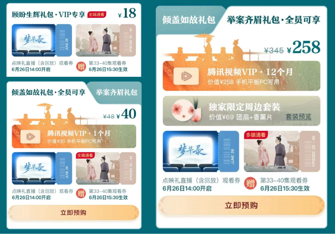 按照腾讯视频的规则,《梦华录》大结局点映礼直播将于6月26日开启,但只有在活动期间购买了“《梦华录》大结局点映礼”礼包中任意一种礼包的用户,才有资格观看点映礼直播。而上述的“礼包”一共有3种,分别为18元的“顾盼生辉礼包”、40元的“倾盖如故礼包”,和258元的“举案齐眉礼包”。