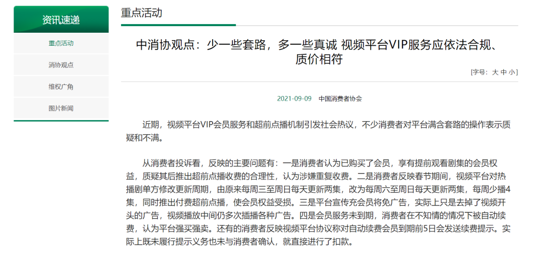 2021年9月,中国消费者协会发表观点称,“少一些套路,多一些真诚。视频平台VIP服务应依法合规、质价相符。”同年10月,爱奇艺、腾讯视频、优酷三大平台陆续宣布全面取消超前点播。