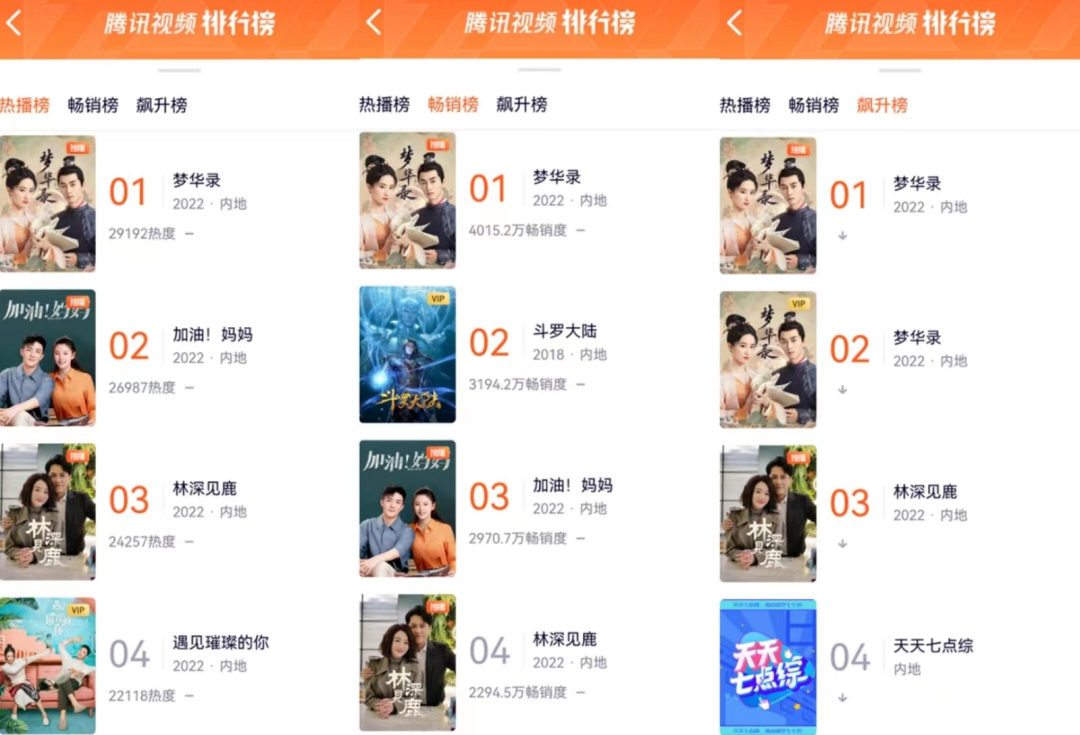 除广告收入外,《梦华录》的会员拉新收入也不会太低。《梦华录》一直位列腾讯视频热播榜、畅销榜,以及飙升榜上第一名;会员流行热度中,《梦华录》也是畅销榜第一。