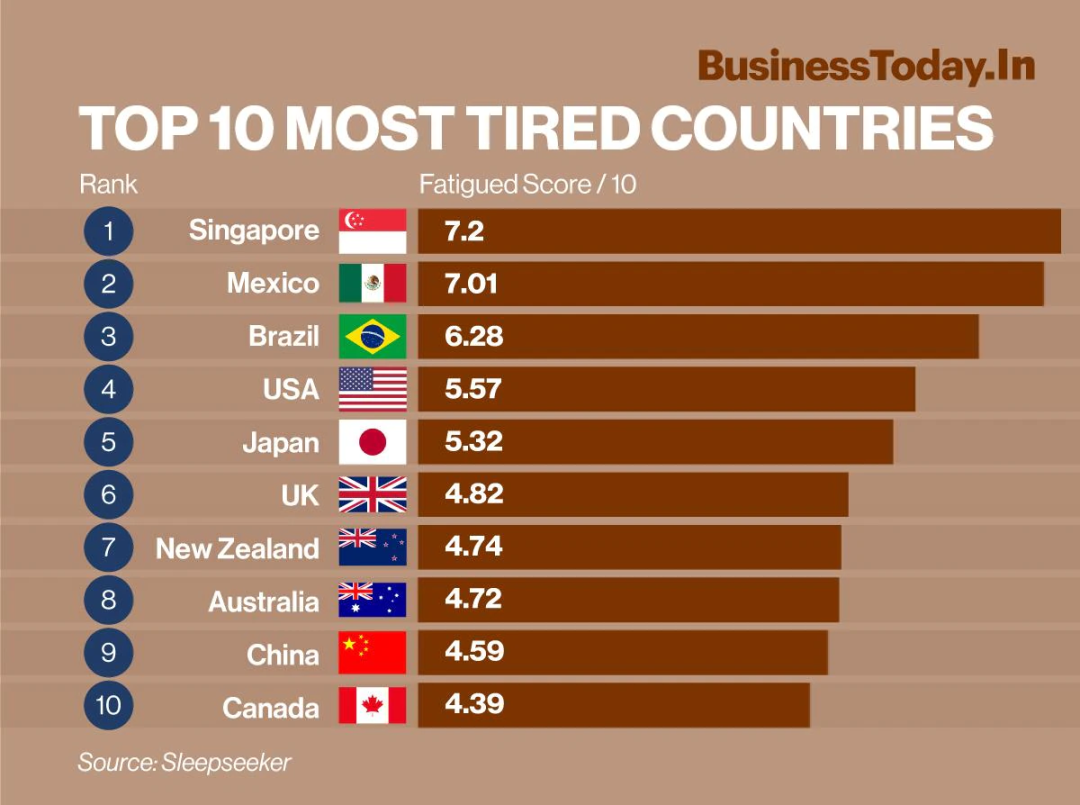 根据Sleepseeker的研究,新加坡是目前世界上最疲劳的国家,疲劳评分为7.20,其次是墨西哥7.01、巴西6.28,其他进入前10名的国家还有美国5.57、日本5.32、英国4.82、新西兰4.74、澳大利亚4.72、中国4.59和加拿大4.39。