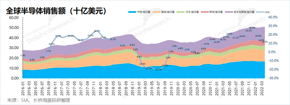 从近期的全球半导体销售额看,单月销售额已经稳定在500亿美元以上。今年以来在局部冲突、疫情等因素的影响下,半导体销售额的增速虽略有回落,但仍保持着两位数的增长。