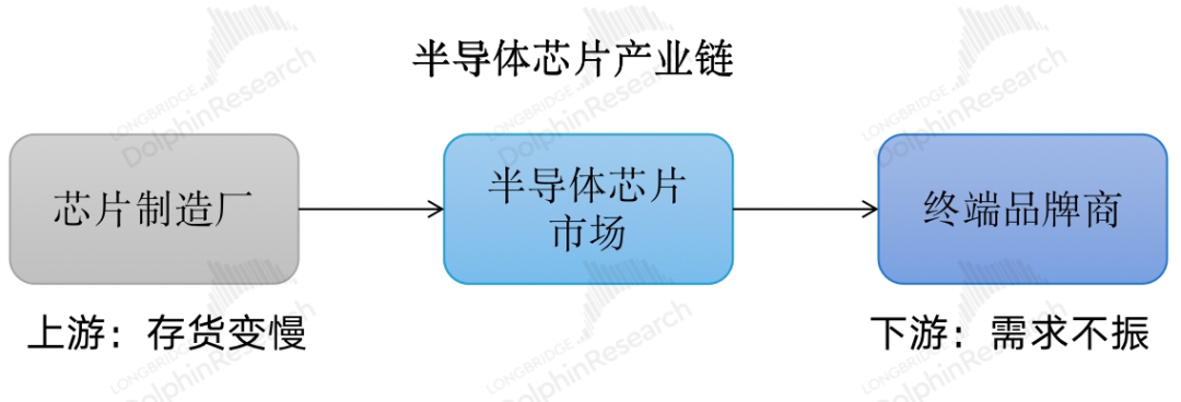 半导体由于是制造业的属性,库存情况成为观察半导体周期的重要指标。从产业链情况看,半导体芯片的上游是芯片制造厂,下游是终端品牌商。从各主要厂商的库存数据看,观察半导体行业的当前周期状况。