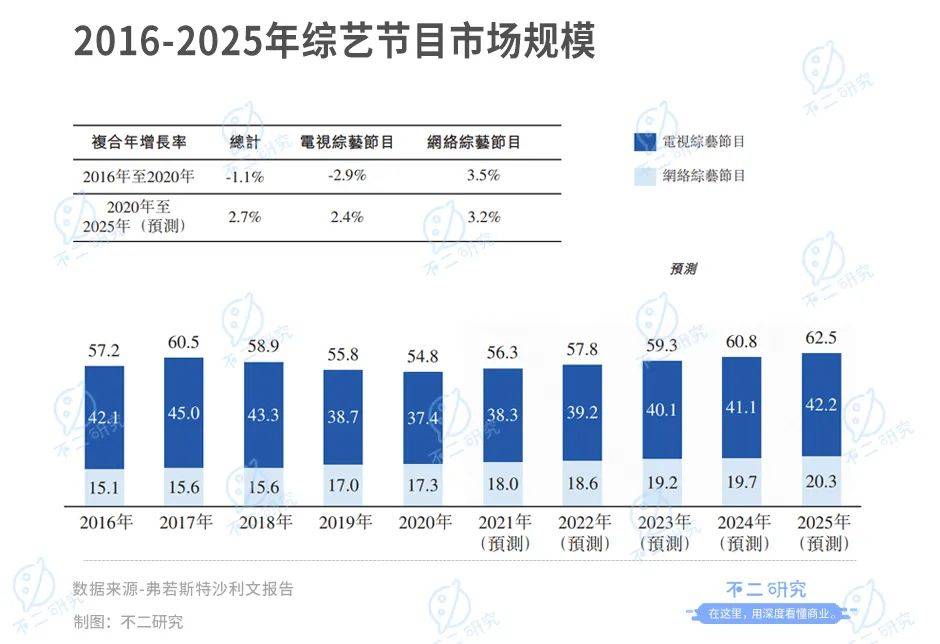 从整体电视综艺节目市场观察,据弗若斯特沙利文报告,2016-2020年,电视综艺节目市场复合年增长率下降2.9%,但以IP为中心的內容运营的进一步发展可能给该市场带来新的增长潜力。预计该市场的复合年增长率将于2020-2025年期间保持稳定,约为2.4%,至2025年将达至约422亿元。