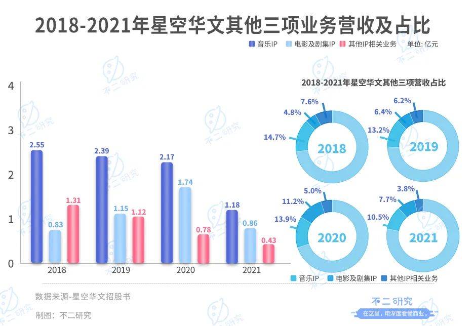 其他IP相关业务2018-2021年营收分别为1.31亿元、1.12亿元、0.78亿元和0.43亿元;分别占总营收的7.6%、6.2%、5.0%和3.8%。