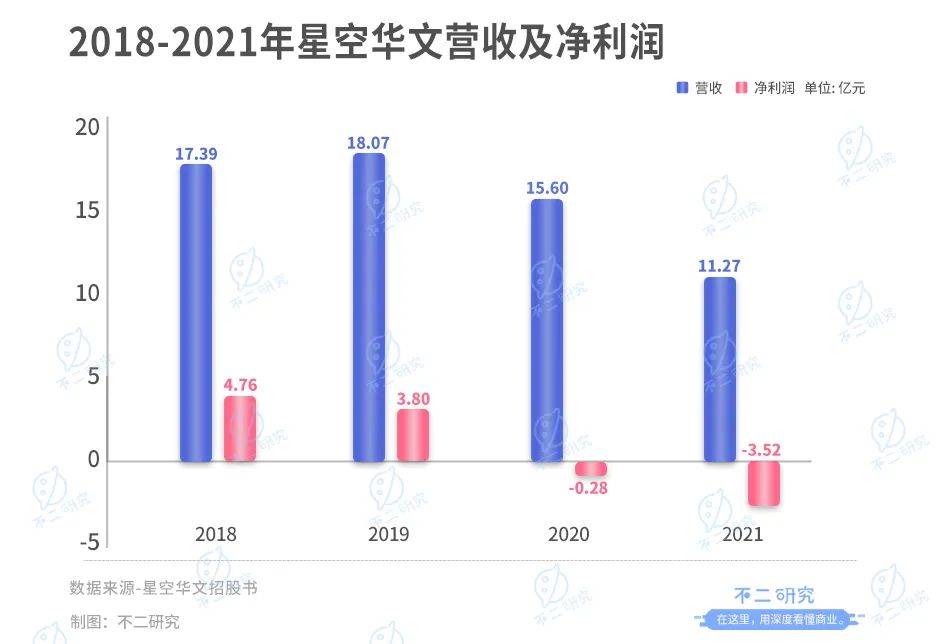 据招股书显示,2018-2021年,星空华文的收入分别为17.39亿元、18.07亿元、15.60亿元和11.27亿元。其中2020年和2021年营收分别同比下降13.67%和27.77%。