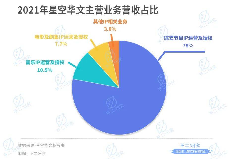 星空华文的主营业务分为综艺节目IP运营及授权、音乐IP及授权、电影及剧集IP运营及授权和其他IP相关业务。其营收在2021年分别占总营收比重78%、10.5%、7.7%和3.8%。