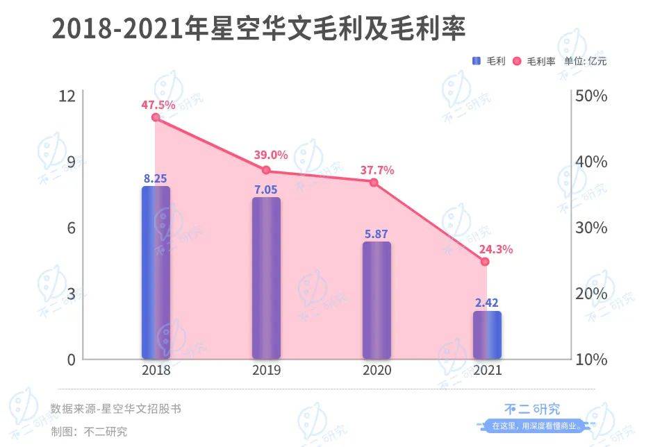 与此同时,毛利及毛利率的情况也不乐观。2018-2021年,星空华文的毛利分别为8.25亿元、7.05亿元、5.87亿元和2.74亿元;毛利率分别为47.5%、39.0%、37.7%和24.3%。