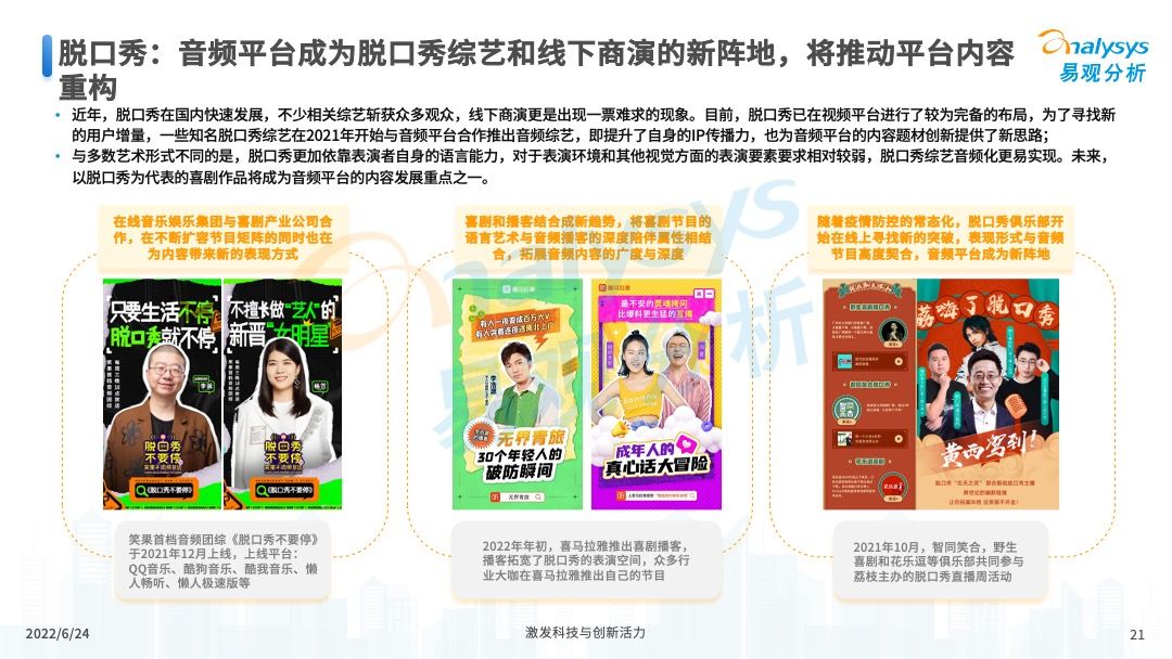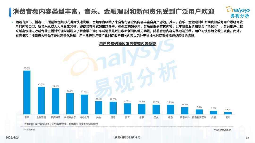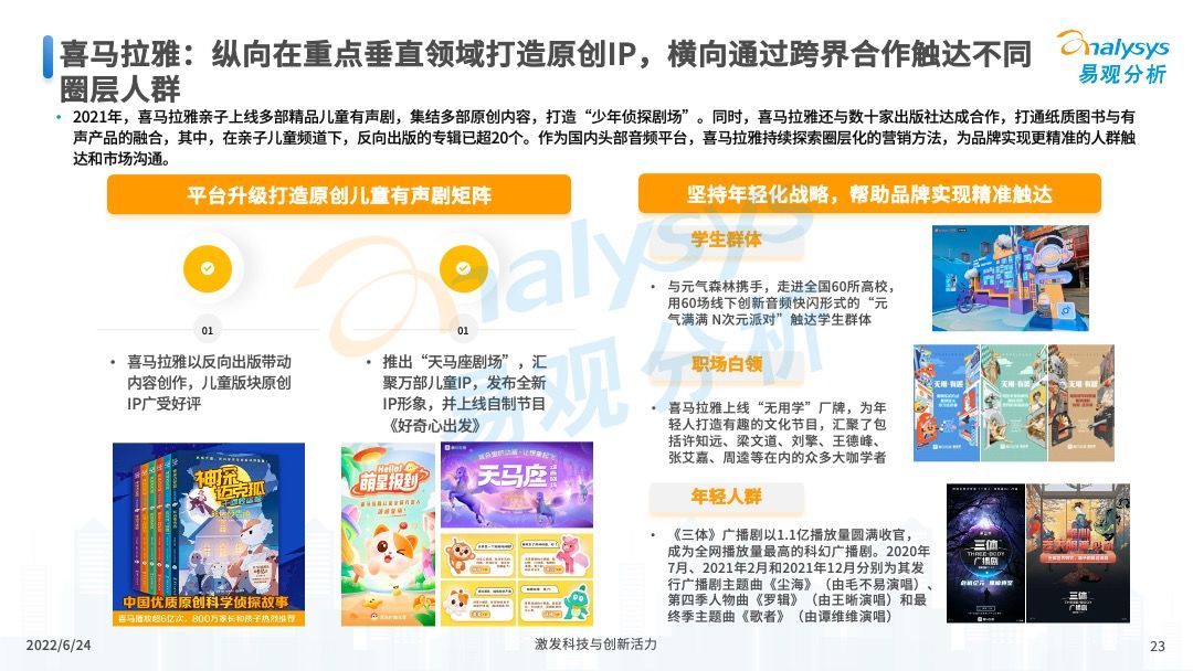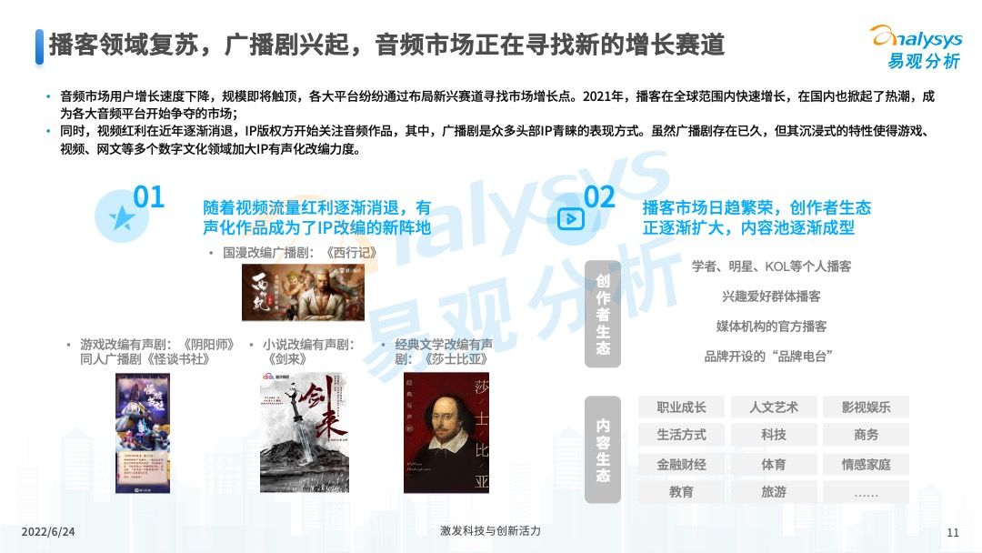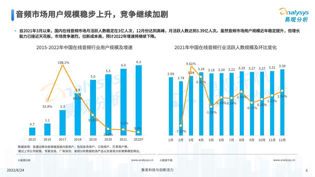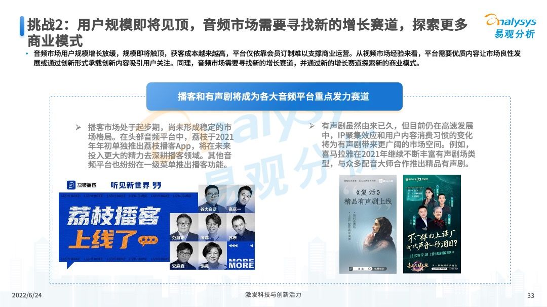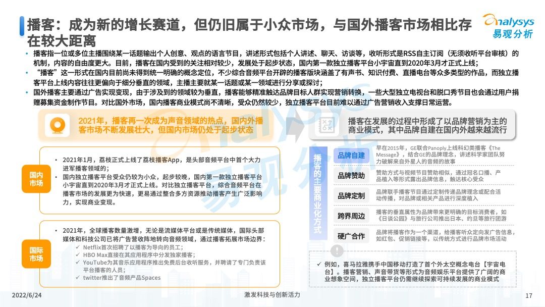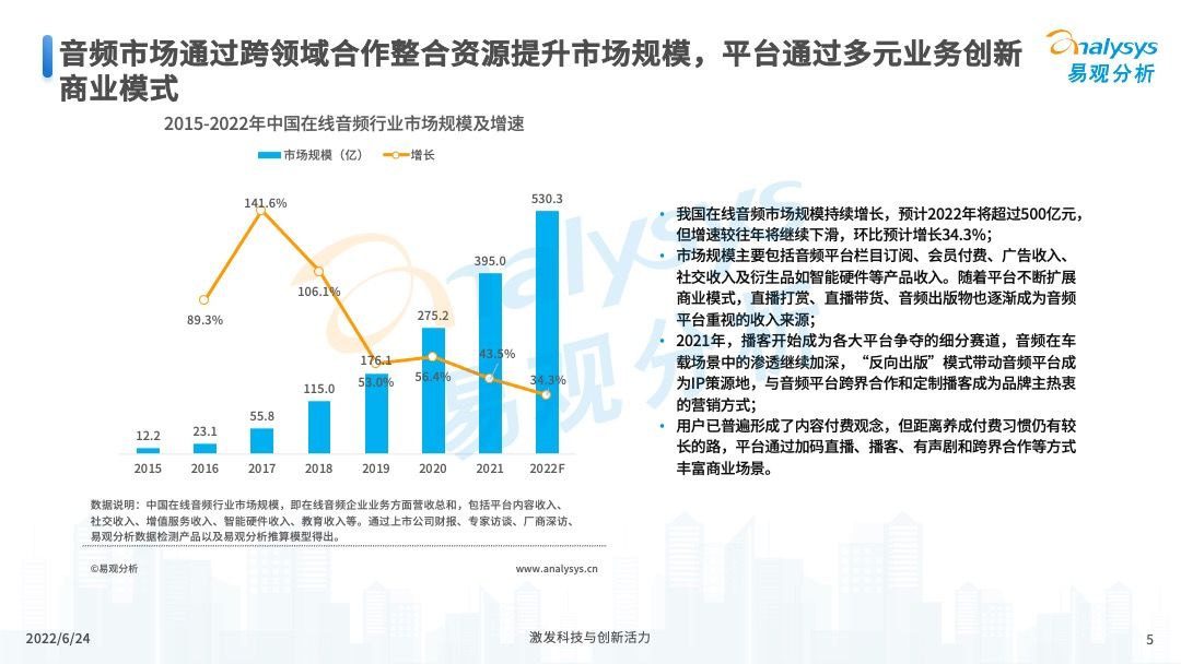 图片来源@视觉中国文|易观分析我国在线音频市场规模持续增长,预计2022年将超过500亿元。2021年,平台通过加码直播、播客、有声剧和跨界合作等方式丰富商业场景,音频在车载场景中的渗透继续加深,“反向出版”模式带动音频平台成为IP策源地,与音频平台跨界合作和定制播客成为品牌主热衷的营销方式。