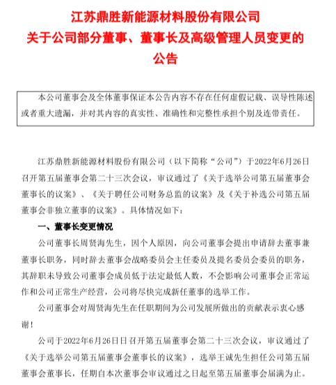 26日晚间,鼎胜新材发布公告称,董事长周贤海向董事会提出申请辞去董事兼董事长职务,同时辞去董事会战略委员会主任委员及提名委员会委员的职务。与此同时,董事、副总经理兼财务总监李香申请辞去董事、副总经理兼财务总监职务。