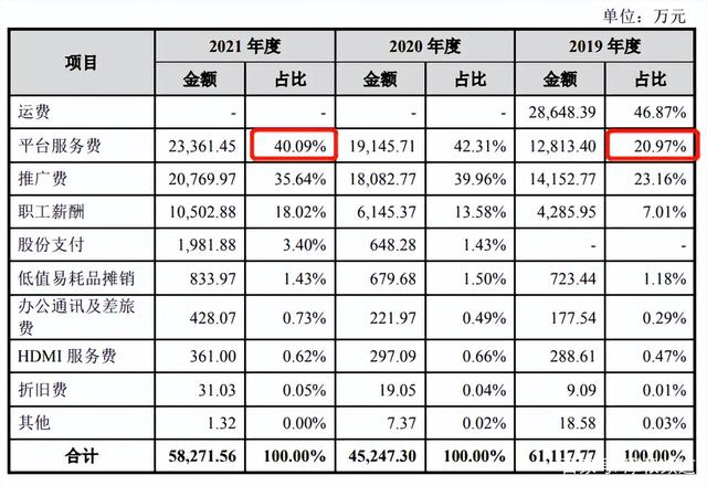 因此,绿联已经很难享受到电商红利。从招股书看到,绿联平台服务费的占比从2019年的20.97%飙升到2021年的40.09%,上涨接近100%。
