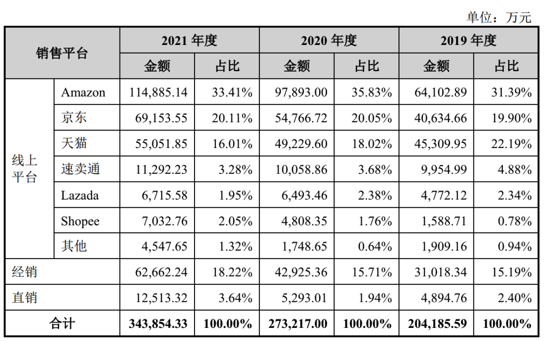其在2019年-2021年间,来自亚马逊的营收金额分别为6.41亿元、9.78亿元和11.49亿元,占营收比重分别为31.39%、35.83%和33.41%。