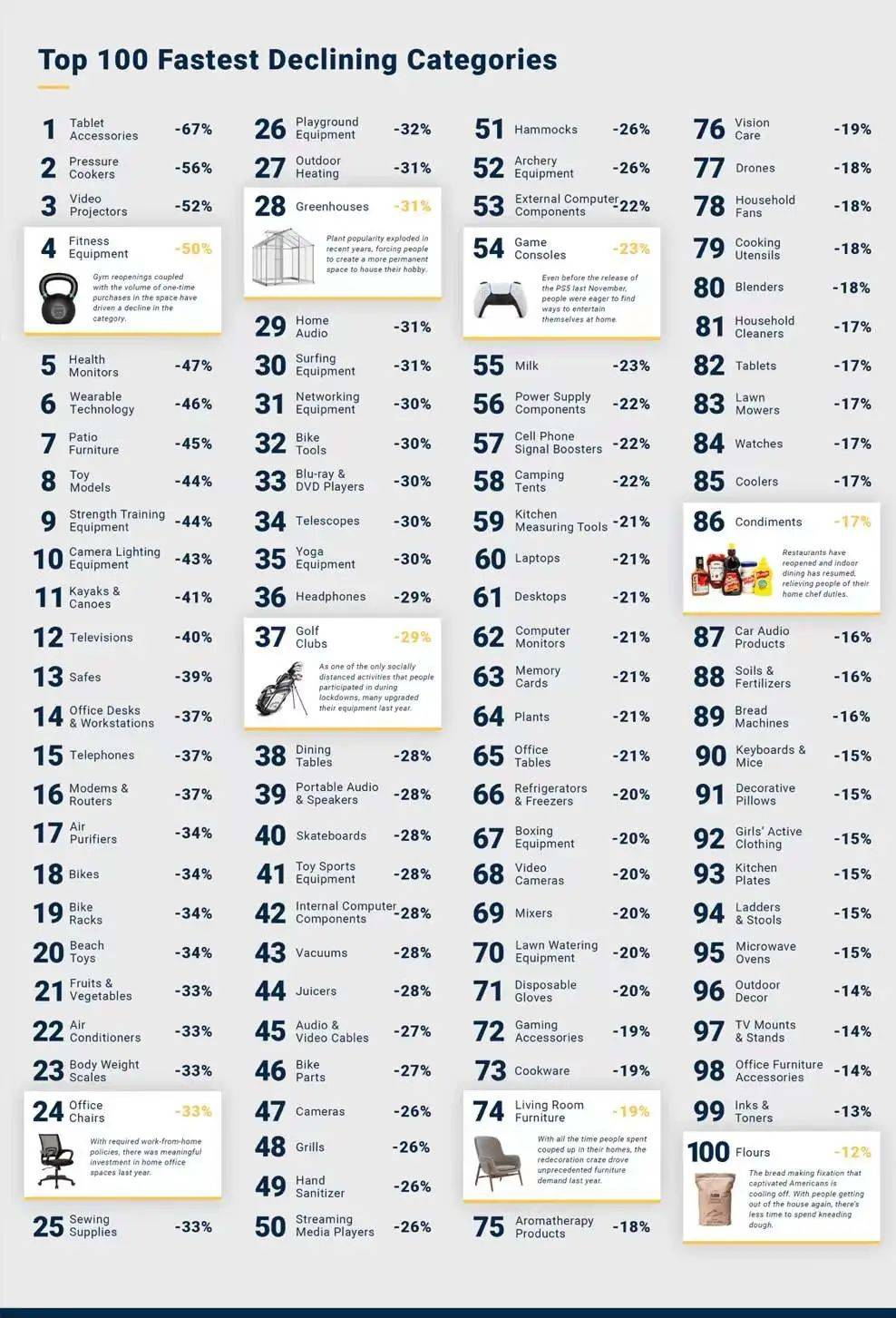 美国零售业调查公司Stackline发布的2020-2021年美国电商增长最快和下降最快的100个类目显示,平板电脑配件是下降最快的类目,同比下降了67%。