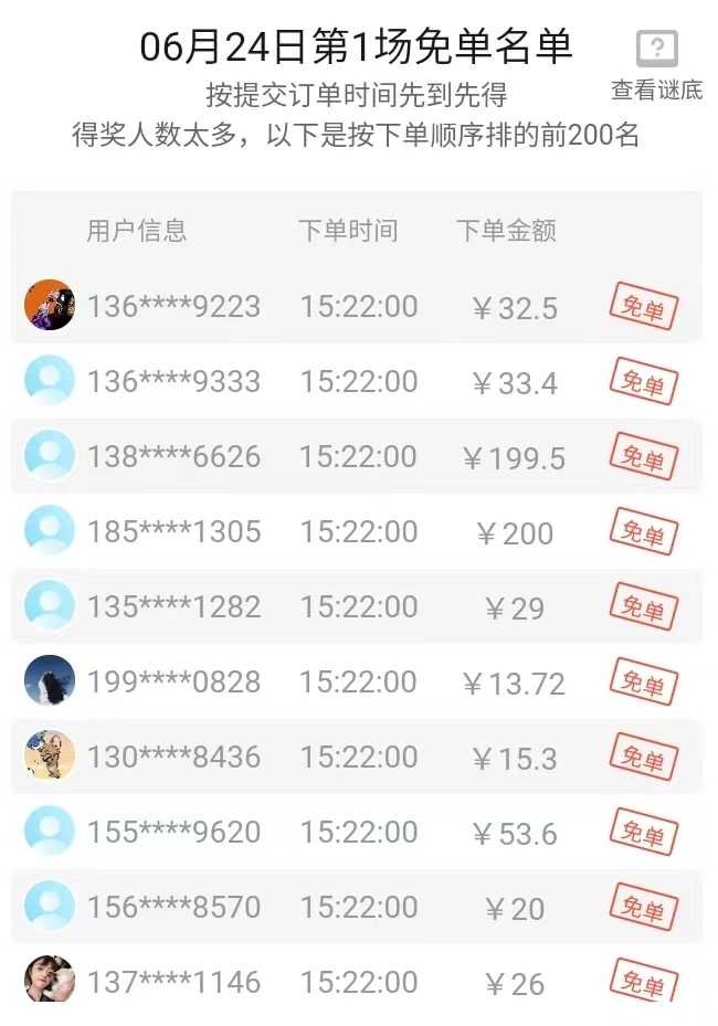 猜中时间的订单,也可能因为排序靠后或者不符合其他条件而最终未获得免单;猜错时间的用户,也只能吃下美食,蜂拥在社交媒体上发布一条“赌狗赌狗,赌到最后一无所有”的动态。