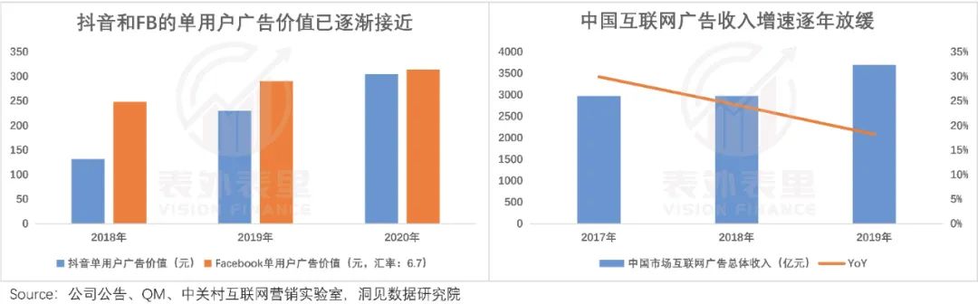 但当时的现实是,一方面,抖音自身的广告收入增长有触顶迹象。如下图,其2019年的单用户广告价值(广告收入/DAU),与Facebook已非常接近(同口径下)。