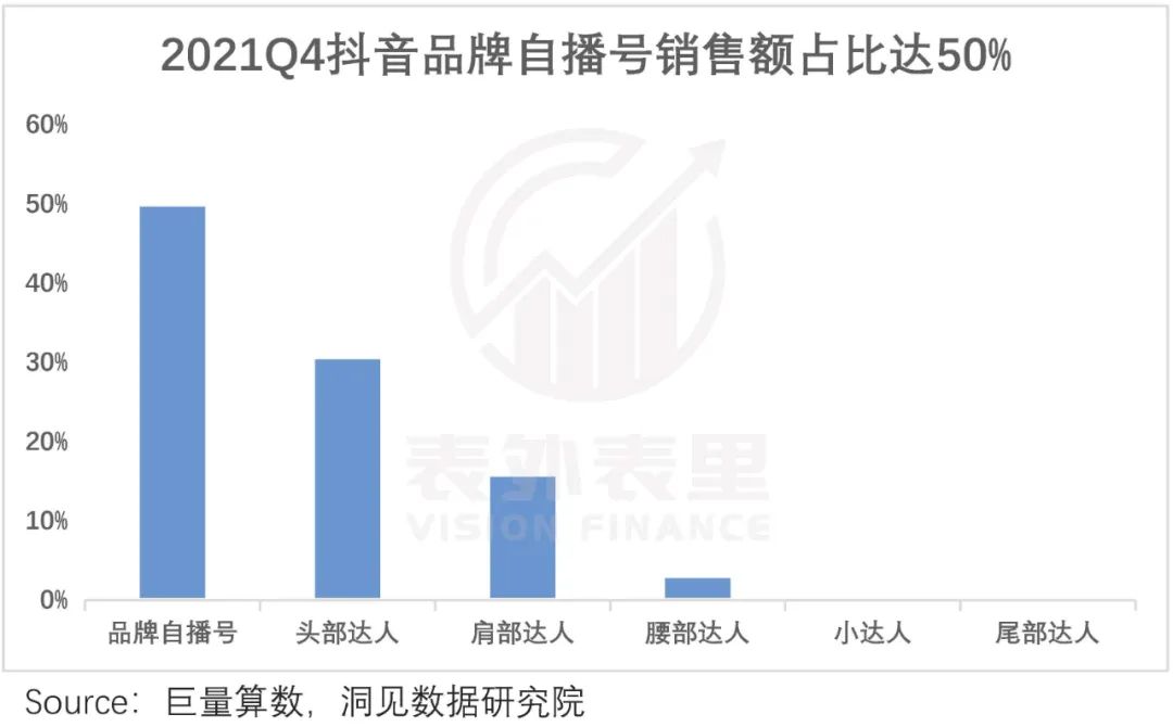 2022年抖音电商第二届生态大会披露的数据显示,2021年抖音电商的GMV同比增长3.2倍,其中达人和品牌自播对GMV的贡献,2021Q4已平分秋色。