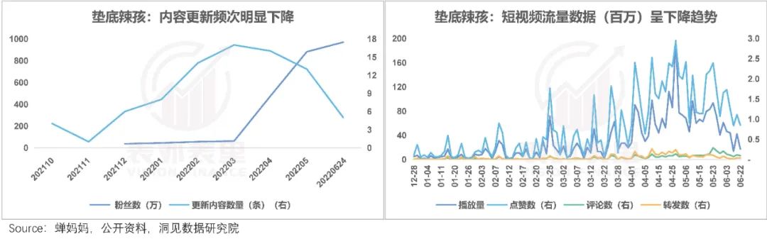 垫底辣孩也是类似情况,今年3月凭借#如何成为一名国际超模#变装视频在抖音爆火后,其粉丝数量持续暴涨,但仅两个月,其单条视频的流量数据就拐头向下。