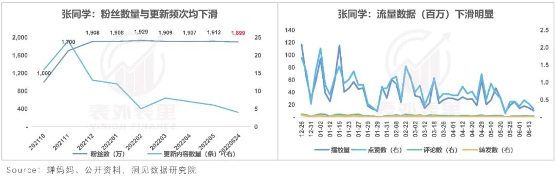 就数据统计上看,去年底爆火的张同学,今年以来粉丝规模虽很稳定,但其单条视频的流量数据,却在持续下滑:已不及之前的十分之一。