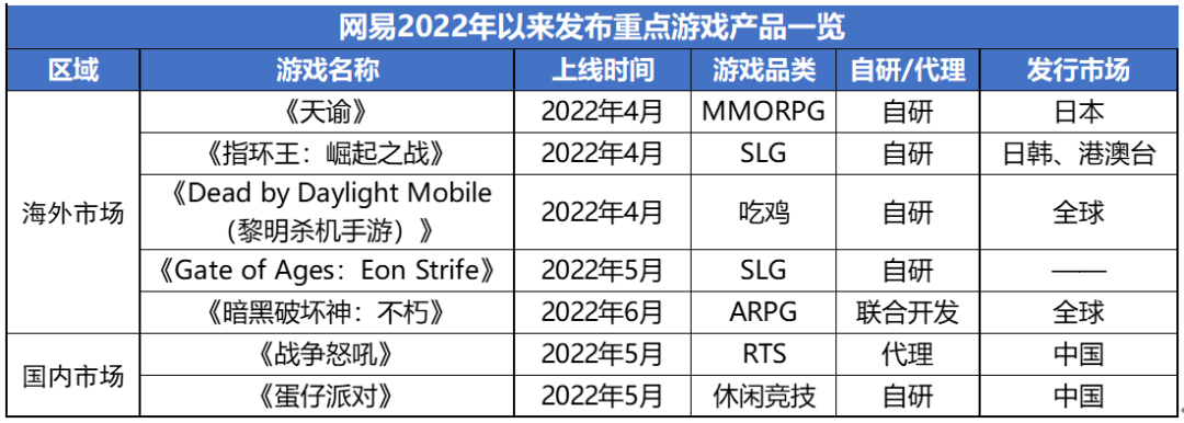 网易22年依然以自研产品为主。从游戏品类来看,竞技、吃鸡类游戏是网易22年重点布局的赛道。