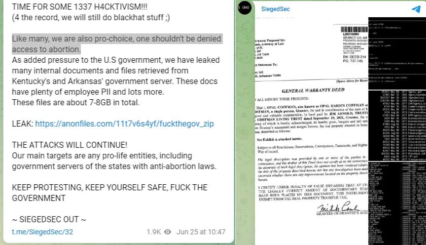 “和许多人一样,我们也支持选择一个人不应该被剥夺获得堕胎服务的机会。为了给美国政府施加压力,我们在此泄露肯塔基州和阿肯色州政府服务器上的文档和文件,包括大量政府员工的个人识别信息和更多资料,总计约7-8GB”