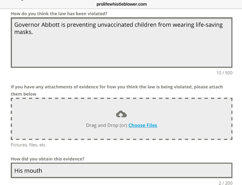 还有举报州长阿博特不让小孩戴口罩是侵害他们生命的,取证来源是“他的嘴”:
