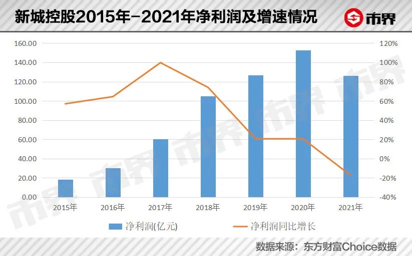 而在后王振华时代,新城控股的增速也开始逐渐放缓。其营收虽然从2018年的541亿增长至2021年的1682.32亿元,但是营收增速却从2019年的58%下滑至2021年的15%;而净利润更是继2014年之后首次进入负增长,2021年净利润为125.98亿元,相较于2018年74%的高增长已经下滑至-17.42%。