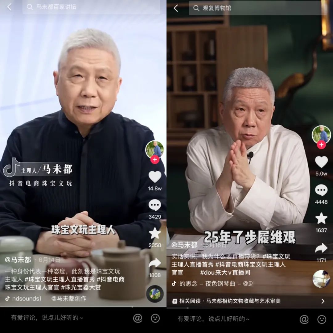 另一方面,马未都开启直播带货的背后,也可以看出,抖音官方对于这个赛道的看好,同时,也可以解读为对于抖音文玩带货分散化,无名人背书的行业情况所采取的应对。在马未都带货的前几天,多位抖音文玩博主与马未都隔空互动,从这一点可以看出,大量博主渴望得到类似于马未都的流量以及信任背书。