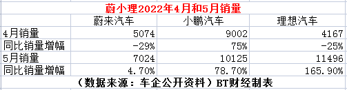 而在随后的4月和5月中,蔚来更是疲态尽显,4月,蔚来销量下滑29%,销量仅为5074辆,小鹏销量为9002辆,增幅为75%,理想销量为4167,下滑25%。5月,蔚来销量为7024辆,同比增幅4.7%,小鹏销量10125辆,同比增幅78.7%,理想销量为11496辆,同比增幅165.9%。无论是销量还是增幅,蔚来都在三强中垫底,“蔚小理”的排名已经名不副实。