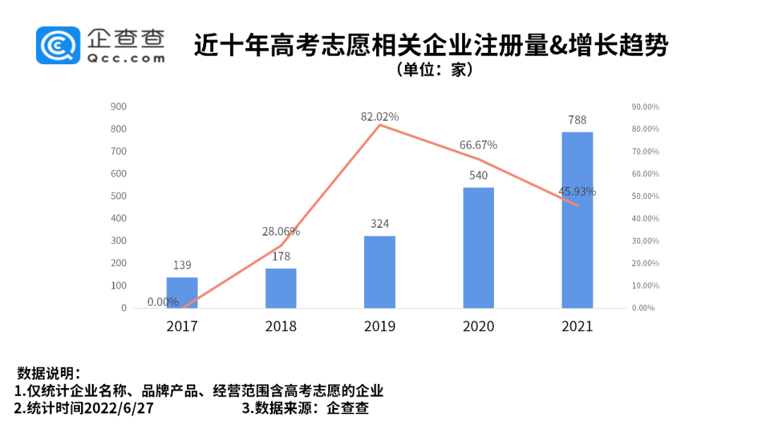企查查数据显示,我国现存高考志愿填报相关企业2033家。近10年来,关于高考志愿填报的企业注册量逐年增加。2017年-2021年分别新增139家、178家、324家、540家和788家。