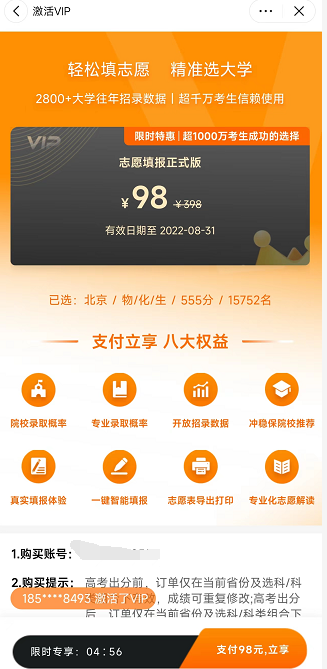 「创业最前线」在某志愿填报App输入预估考试成绩之后,系统自动给出了全省估算排名,以及部分学校的录取概率,但如果想查看更多,就需要购买原价为398元,现价为98元的志愿填报卡。