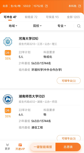 在使用志愿填报卡的时候,只需要在页面上输入考生的成绩和选考科目,系统就会自动生成三档志愿推荐,分为“冲”、“稳”、“保”三档,建议按照6:18:6的比例报考。同时,系统会根据输入的成绩,为考生推荐匹配的分数段可以选择的专业。