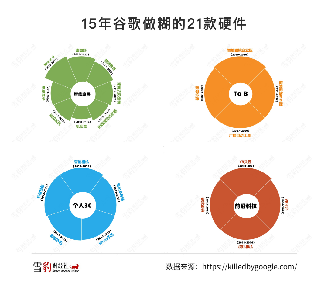 据雪豹财经社不完全统计,从2007年至今,谷歌做失败了21款硬件,其中既有消费电子类和智能家居类,也有专门面向B端开发的硬件,半路夭折的名单中不乏曾经轰动一时的谷歌眼镜、Nexus手机、谷歌路由器等明星产品。