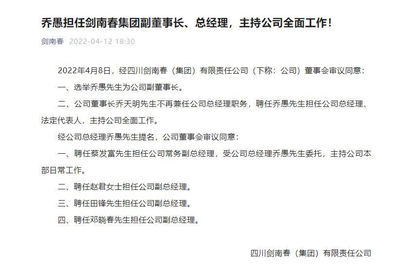 少东家正式继位,意味着剑南春内部高层也会大洗牌,这一点,从乔愚履新公告中可以清楚看出。乔愚提名的剑南春集团4位副总经理中,除了蔡发富是父辈老臣,其余3位都是年轻人。