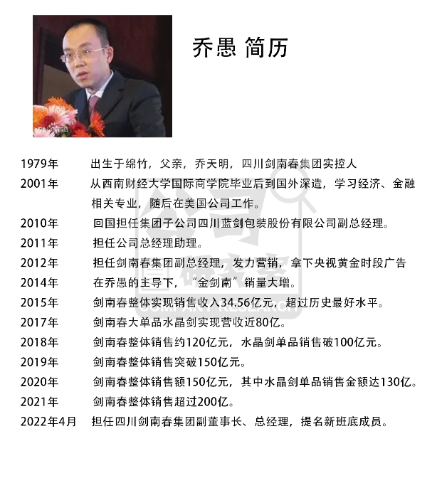 这让外界更是好奇:乔愚是谁?剑南春新掌门究竟是一个怎样的人?