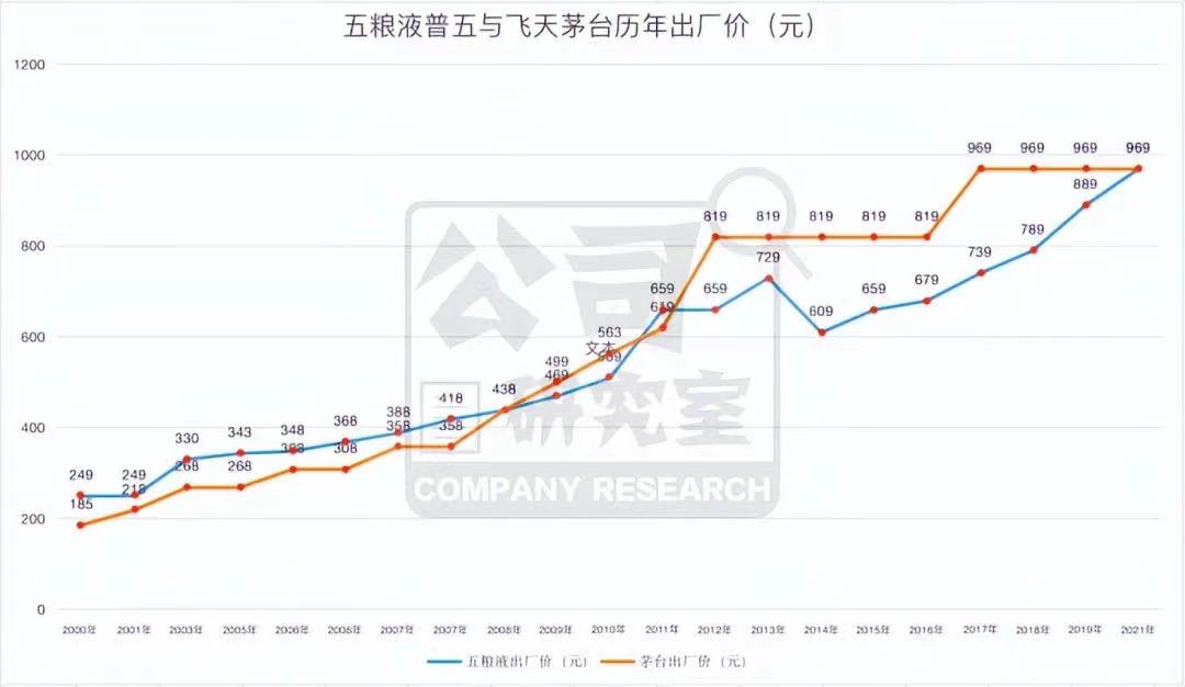 公司研究室注意到,1990年代,茅五剑齐名时,五粮液零售价300+,贵州茅台200+,剑南春100+;2000年后,茅台市场价500元,五粮液600元,剑南春200元。后来,茅台领涨,五粮液、泸州老窖等紧随。剑南春却长期维持在200多元,涨到300多元用了多年时间。