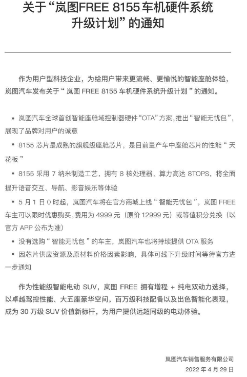 要知道,高通8155座舱芯片的官方零售价已经高达2,995美元(折合人民币20,230元),在岚图的升级通知中,只要4999元就能拥有,而且还包含去4S店改装的费用。