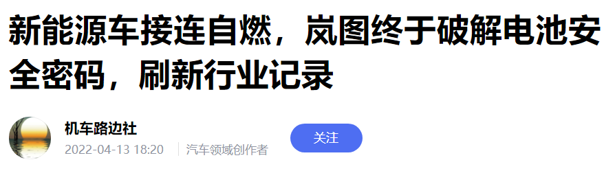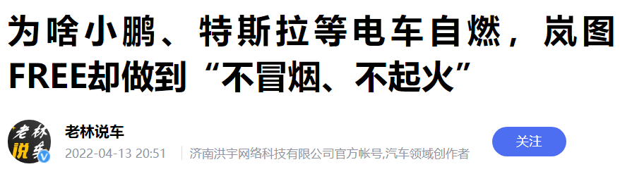 例如,“为啥小鹏、特斯拉等电车自燃,岚图FREE却做到‘不冒烟、不起火’”,“新能源车接连自燃,岚图终于破解电池安全密码,刷新行业记录”,这些文章似乎在告诉用户,别家的电池安全都差点意思,只有岚图在电池安全方面的技术做到了无懈可击。