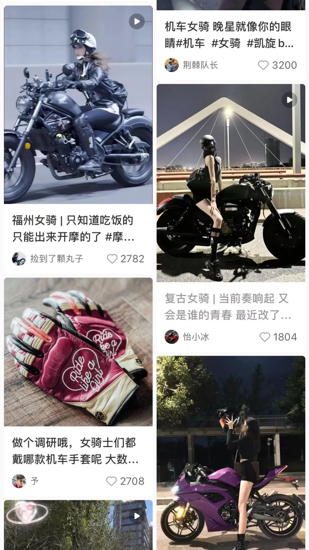 其中,“女骑”是首屈一指的流量之王,博主们纷纷戴上复古头盔,穿着吊带和热裤,跨坐在帅气十足的摩托车上秀着美好的身材。还有走“痞幼风”的博主穿着JK制服和百褶格纹裙开起了摩托,少女心和酷飒的摩托车文化形成强烈反差。