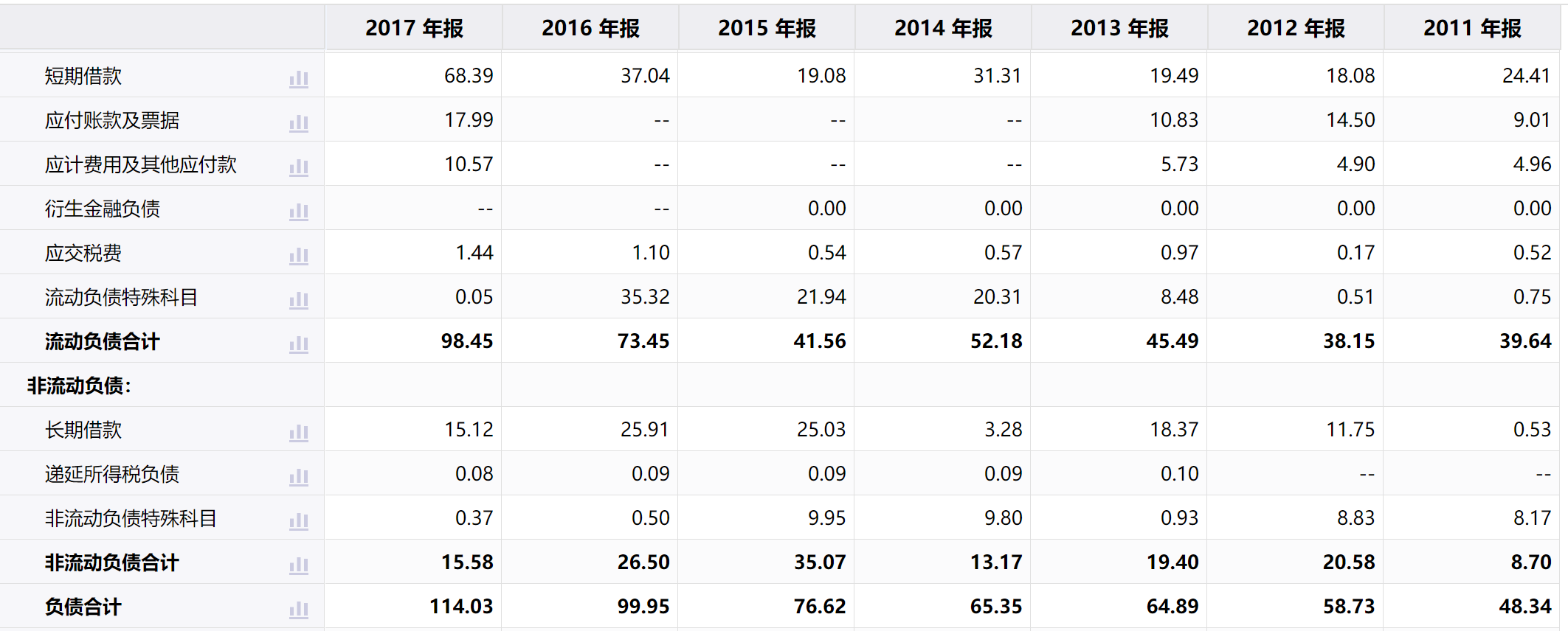 与此同时,汇源的负债金额居高不下,达到百亿元级别。2011年至2017年间负债总额达到48.34亿元、58.73亿元、64.89亿元、65.35亿元、76.62亿元、99.95亿元、114.03亿元。