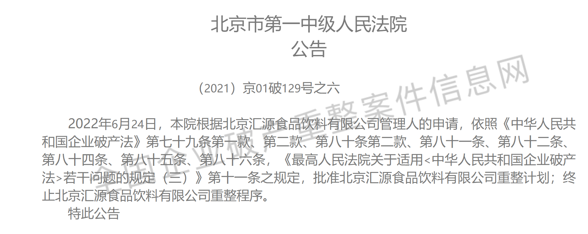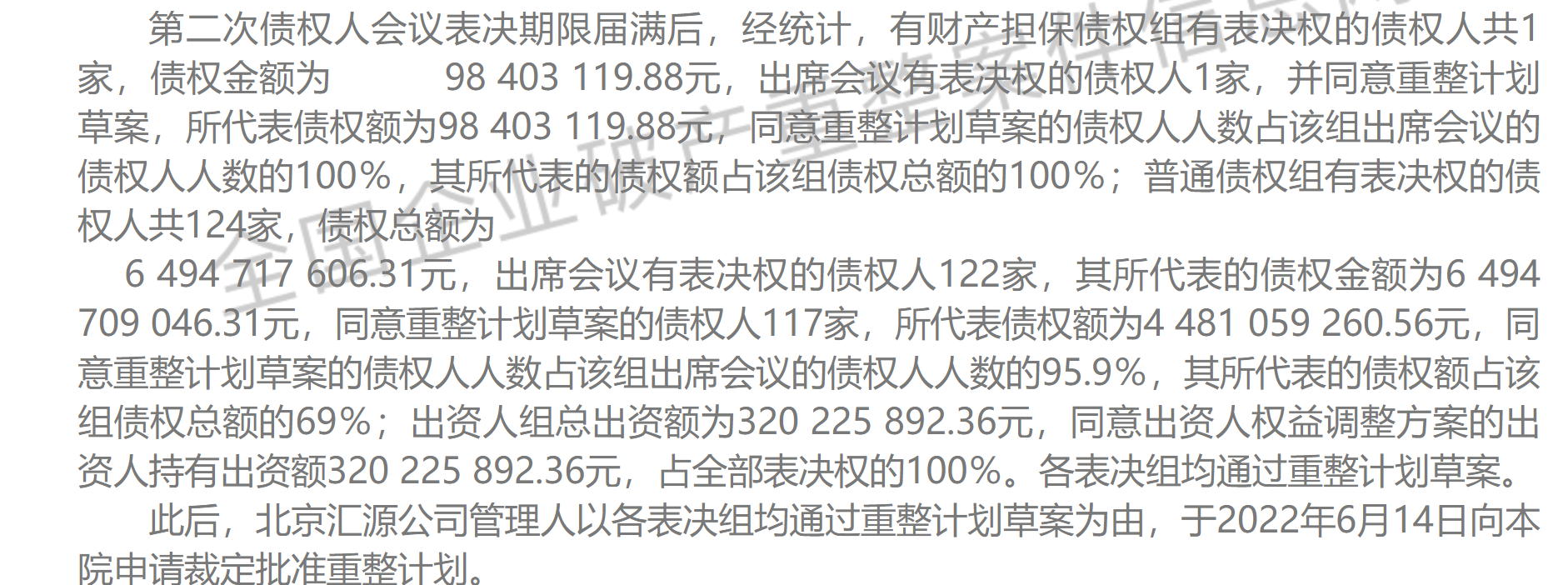 2021年7月16日,经债权人申请,法院裁定汇源进入重整程序。文盛资产作为重整投资人对汇源的资产负债与企业价值梳理形成重整投资方案。2022年5月20日,汇源第二次债权人会议召开,各组债权人均表决通过汇源重整计划。2022年6月24日,北京市第一中级人民法院裁定批准汇源重整计划。