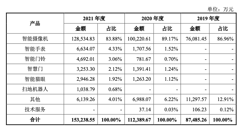 招股书数据显示,2019年-2021年期间,来自智能摄像头产品的营收分别为7.61亿元、10.02亿元以及12.85亿元,占总营收比例分别为86.96%、 89.17%以及 83.88%。其他诸如手表、门铃、扫地机器人等智能家居产品的营收占比均不到一成。![]()