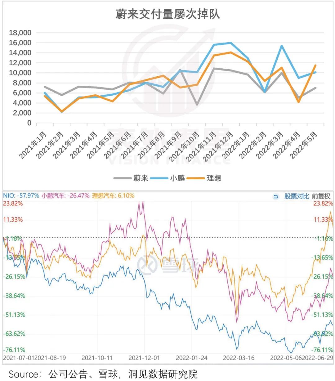 而销量的下滑,让投资人大失所望,市值也从新势力的排头兵位置跌落。