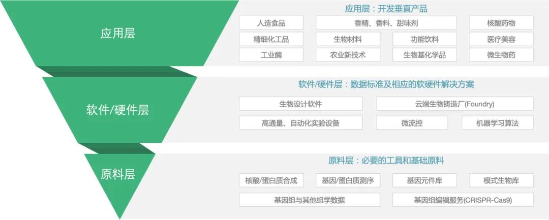 合成生物产业链可按照上下游分为原料创新、软硬件开发和具体产品应用三部分。在具体应用层,医药健康是合成生物产业中最大的下游领域,其次分别为化工、食品饮料、农业及其他消费品。