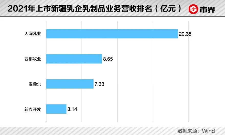 按照2021年的奶制品营收排名,麦趣尔在新疆四大上市乳制品企业中排名第三,位于天润乳业、西部牧业之后。
