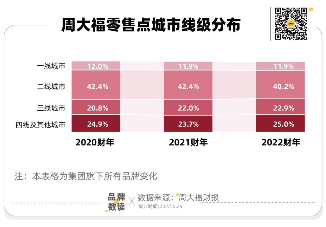 通过品牌矩阵,周大福珠宝涵盖了从年轻、大众到高端的客群,满足了婚嫁及日常佩戴等需求,遍布一线至四线乃至更下沉的市场。