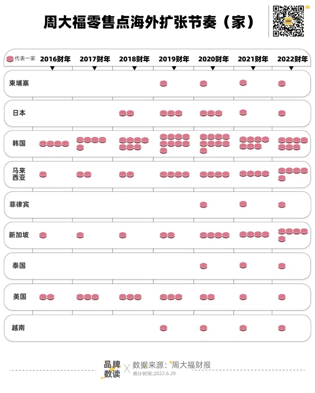 在东南亚及澳洲,佐丹奴拥有570家直营门店,东南亚、南韩及其他市场的加盟销售点有337家。而周大福在海外市场仅有23家门店,且集中在韩国(7家)、马来西亚(5家)和新加坡(5家),覆盖的广度和密度都难以望其项背。