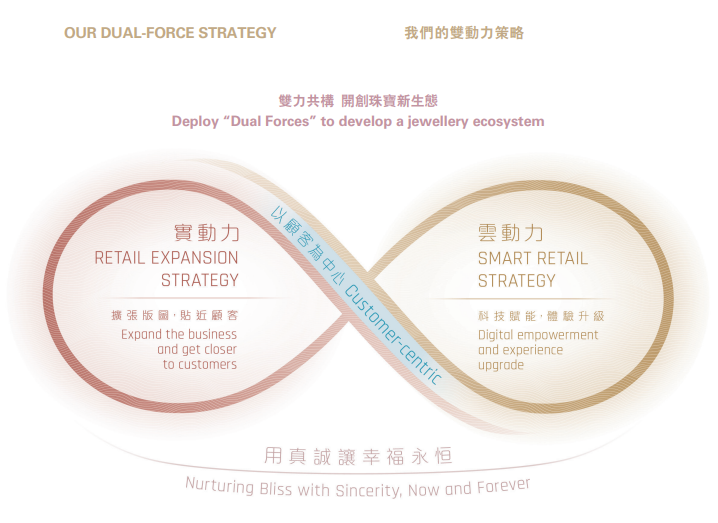 2021年,周大福提出“双动力策略”,双动力是指 “实动力”和“云动力”,“实动力”指零售扩张策略,“云动力”指智慧零售策略。从大策略上不难看出,渠道仍然是周大福核心的增长引擎。