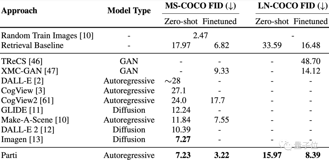 具体在测试结果上,MS-COCO、Localized Narrative(LN,4倍长的描述)上FID分数,Parti都取得了最先进的结果。