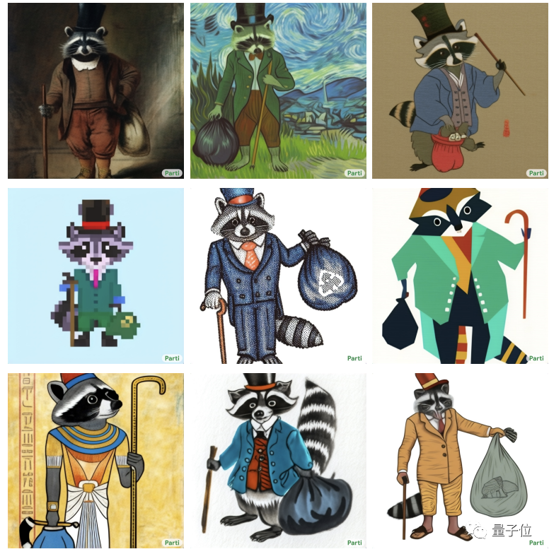 结果Parti也不在话下,一揽子把各种风格的图全给你画出来了~